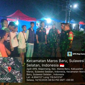 Republik_Kita.id|Maros, 14 Oktober 2025 – Personel Kodim 1422/Maros bersama anggota KIWAL Garuda Hitam PAC Maros Baru melaksanakan patroli keamanan gabungan di wilayah Desa Majannang, Kecamatan Maros Baru, pada Selasa malam.